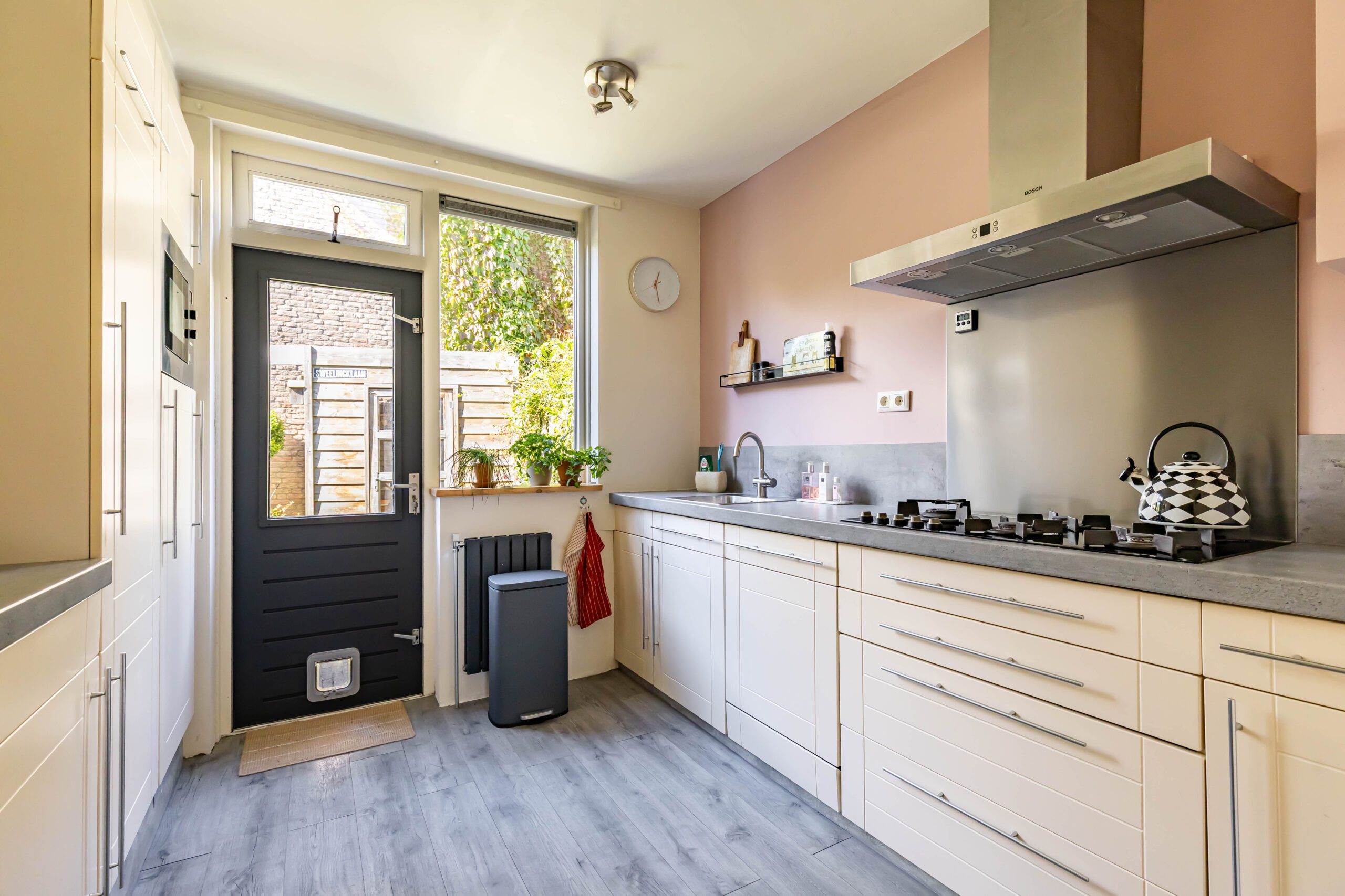 Begane grond: entree, hal met meterkast en toilet, sfeervolle woonkamer van circa 23 m² met deur naar de tuin, dichte keuken v.v. alle inbouwapparatuur en deur naar de tuin, toegang tot de kelder, aan de voorzijde van de woning is een aangebouwde berging van circa 6 m² v.v. elektra, water en wasmachine-aansluiting.