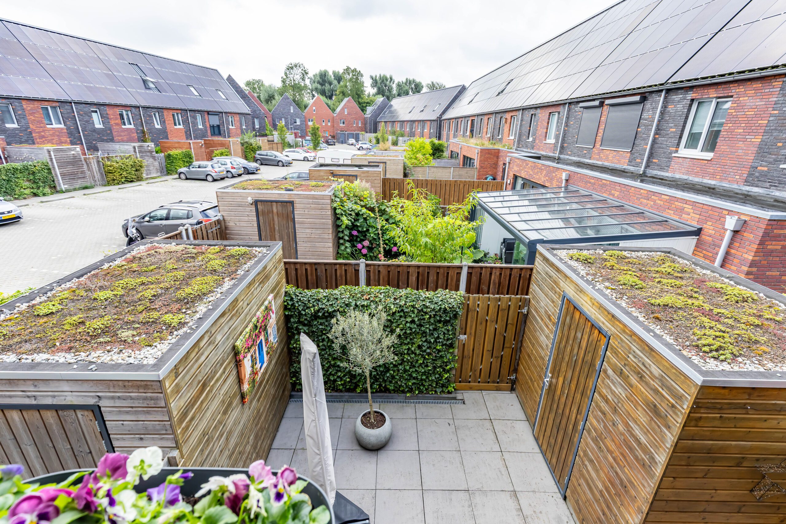 In de tuin staat een vrijstaande houten berging van circa 6 m² met sedumdak.