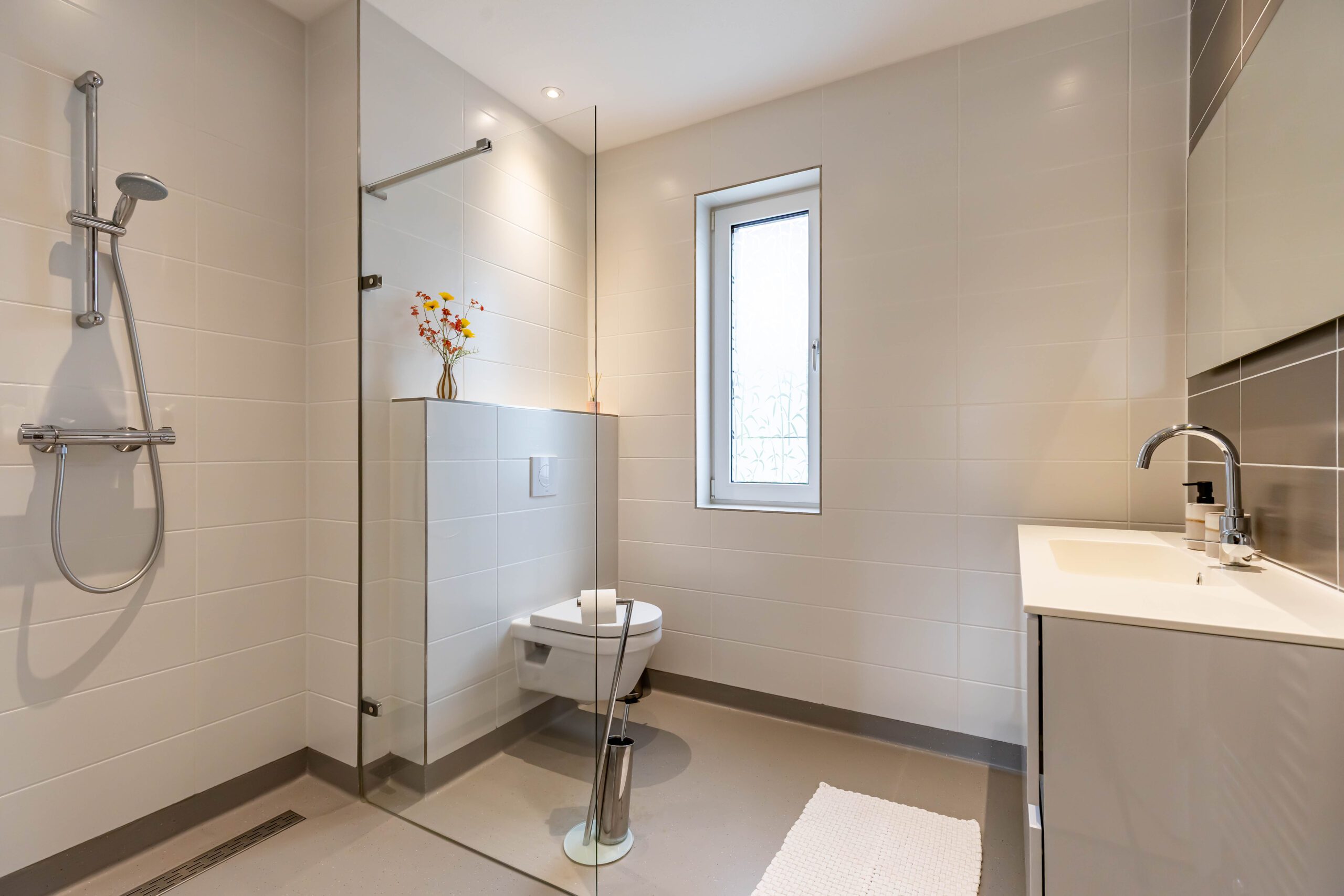 1e verdieping: overloop, twee ruime slaapkamers van resp. circa 14 en 17 m², luxe badkamer met inloopdouche, wastafelmeubel en toilet.