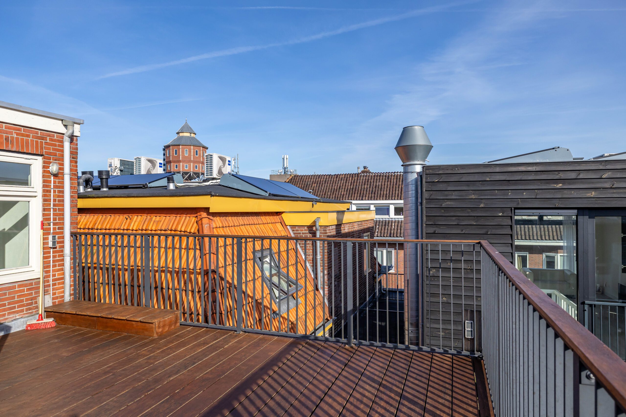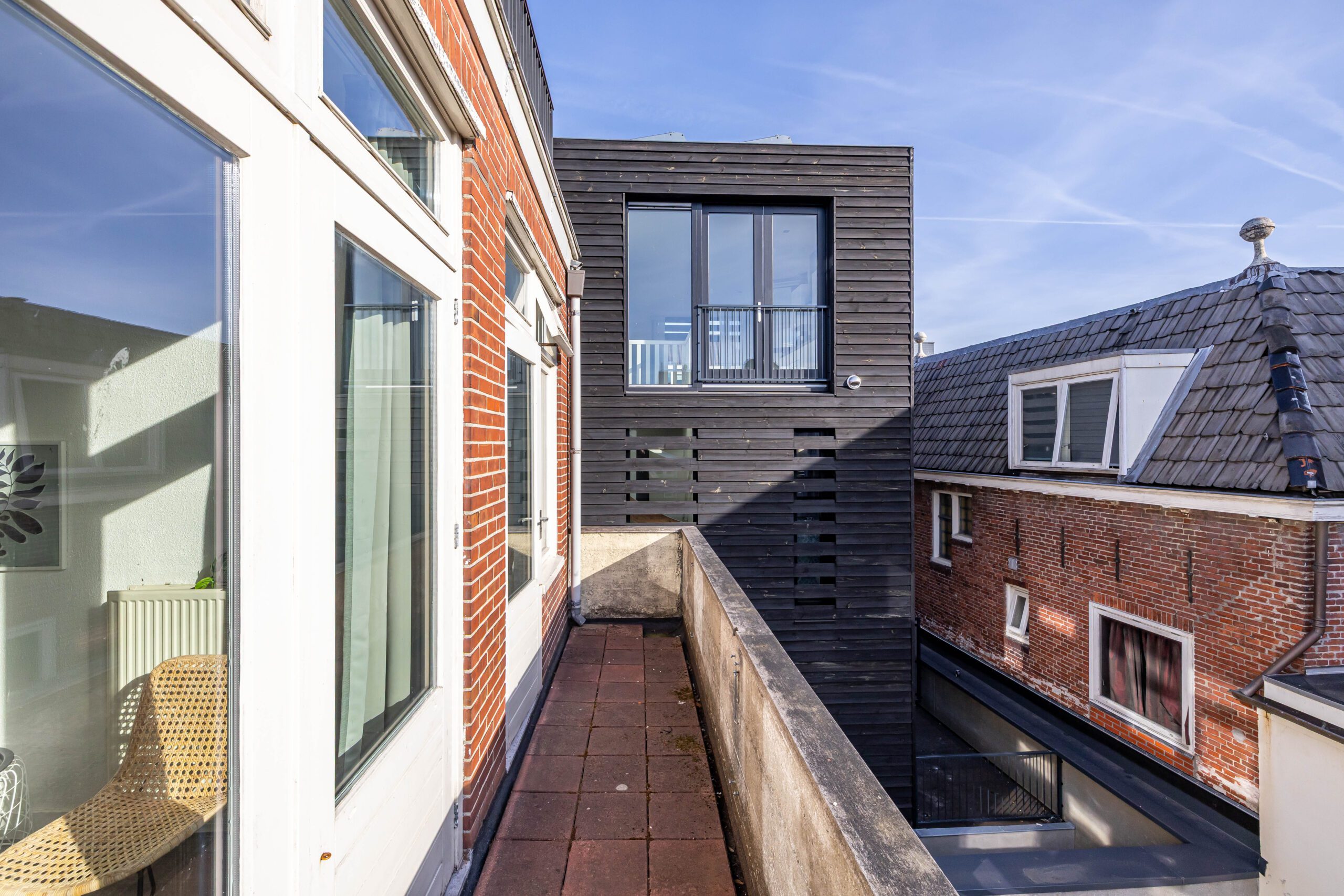 Derde verdieping: overloop met vaste kasten en berging, twee slaapkamers van resp. circa 11 en 18 m² met vaste kasten, via de overloop bereik je het schitterende dakterras van circa 26 m² met uitzicht over de stad naar o.a. de Martinitoren en het Noorderplantsoen.