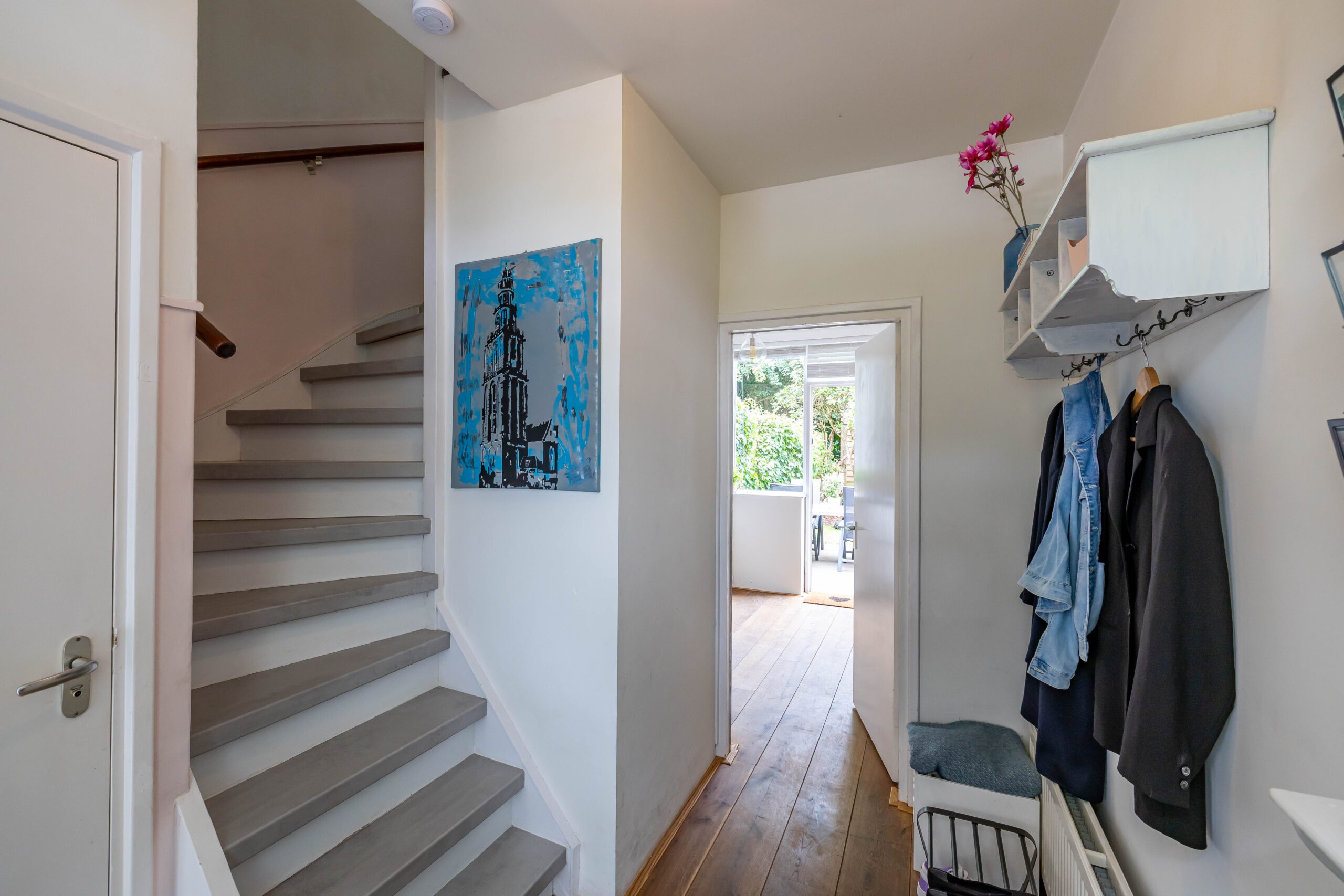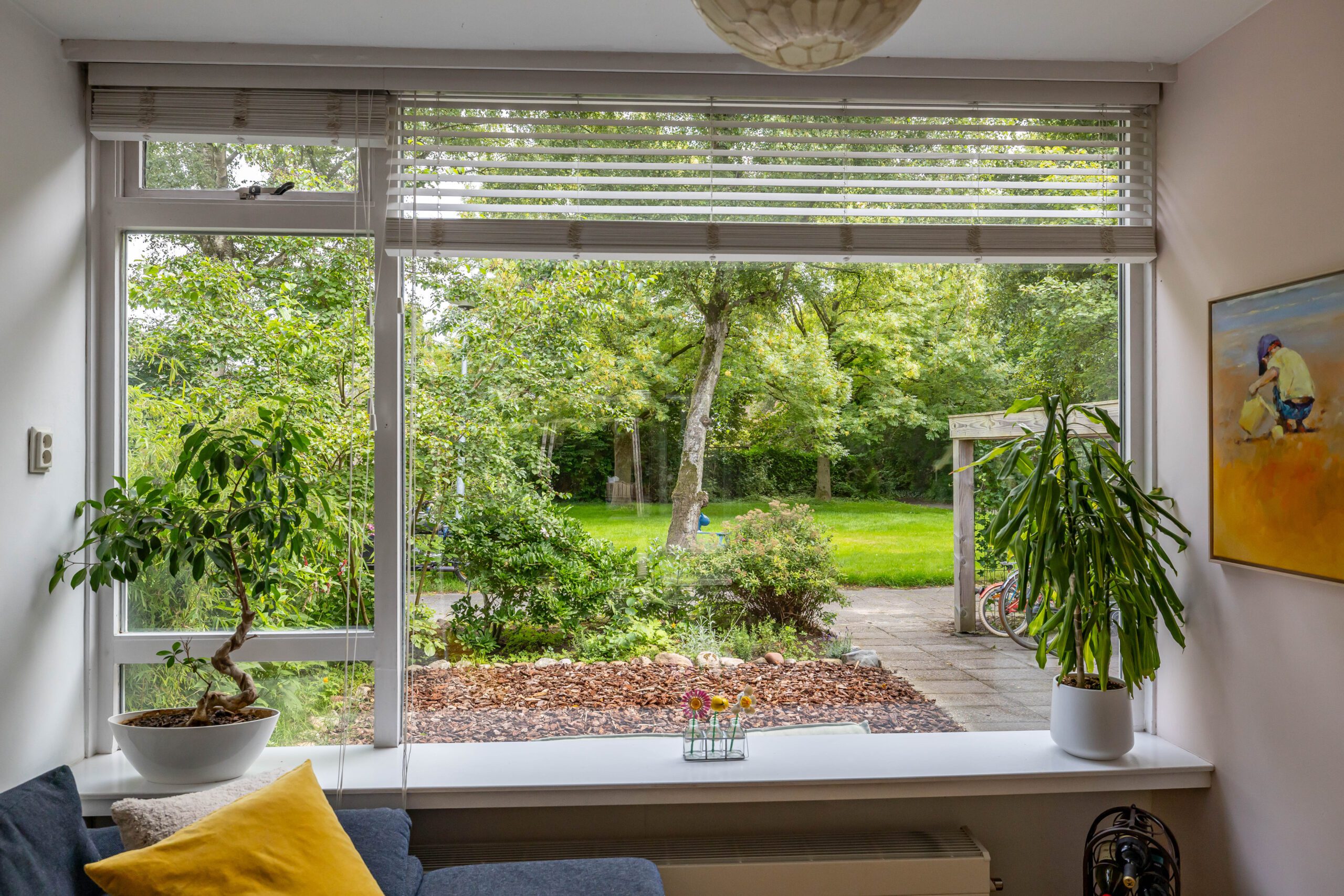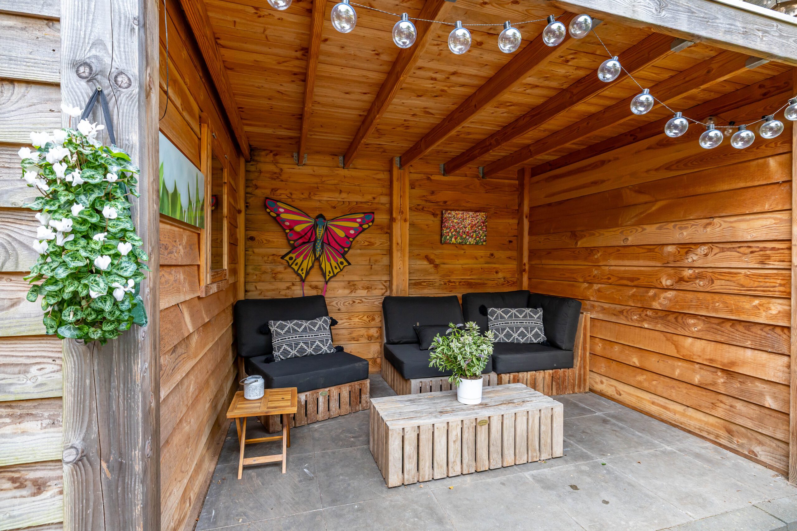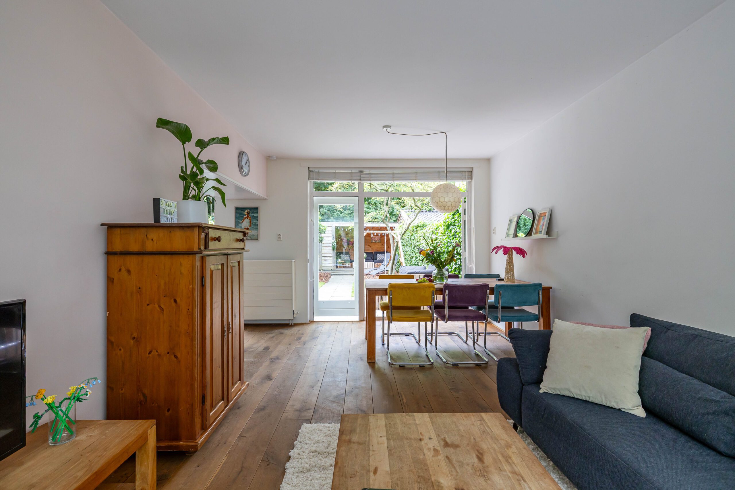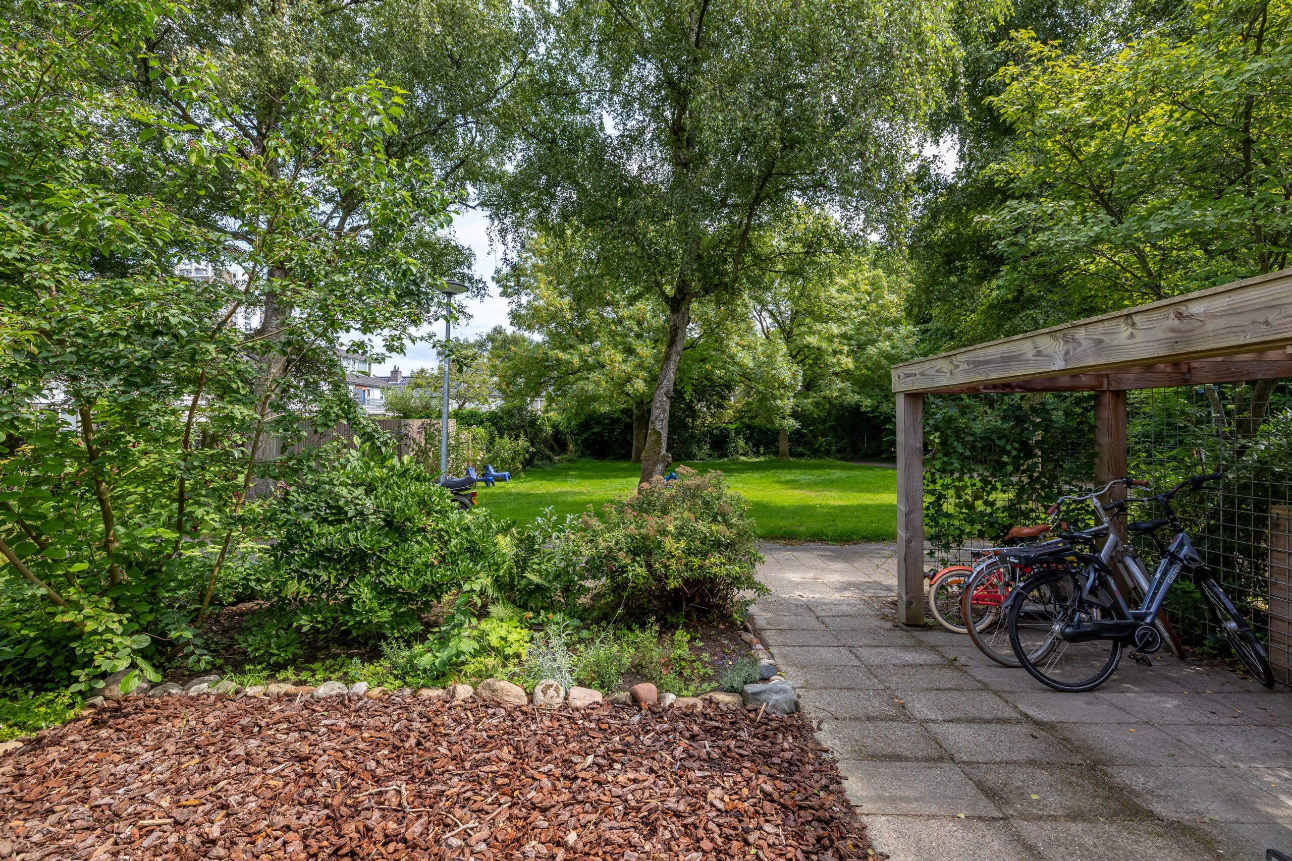 De achtertuin is een waar pareltje: fraai aangelegd met veel groen en dankzij de openslaande deuren voelt de woning in de zomer als één geheel met buiten. De hele dag zon, volop privacy én een knus tuinhuis met veranda maken dit dé plek om te ontspannen.