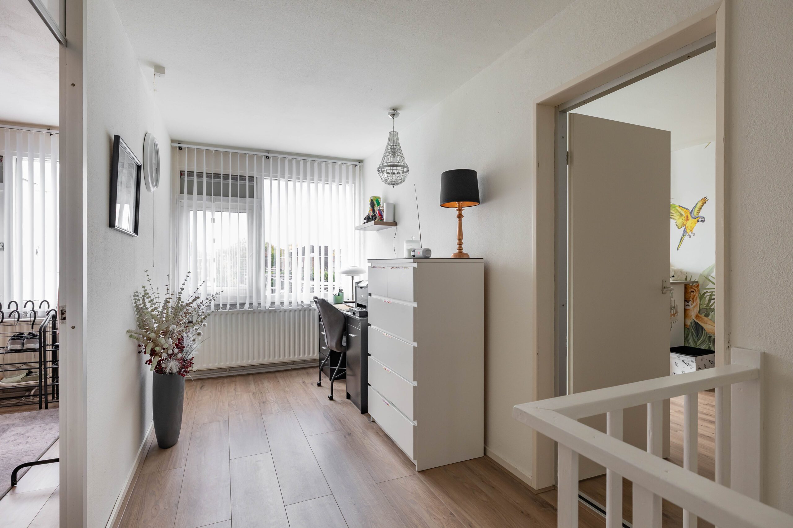Verdieping: ruime overloop van circa 14 m² met werkruimte, drie slaapkamers van resp. circa 10, 14 en 14 m², inpandige berging van circa 5 m² met wasmachine-aansluiting, badkamer met inloopdouche, wastafelmeubel en toilet.