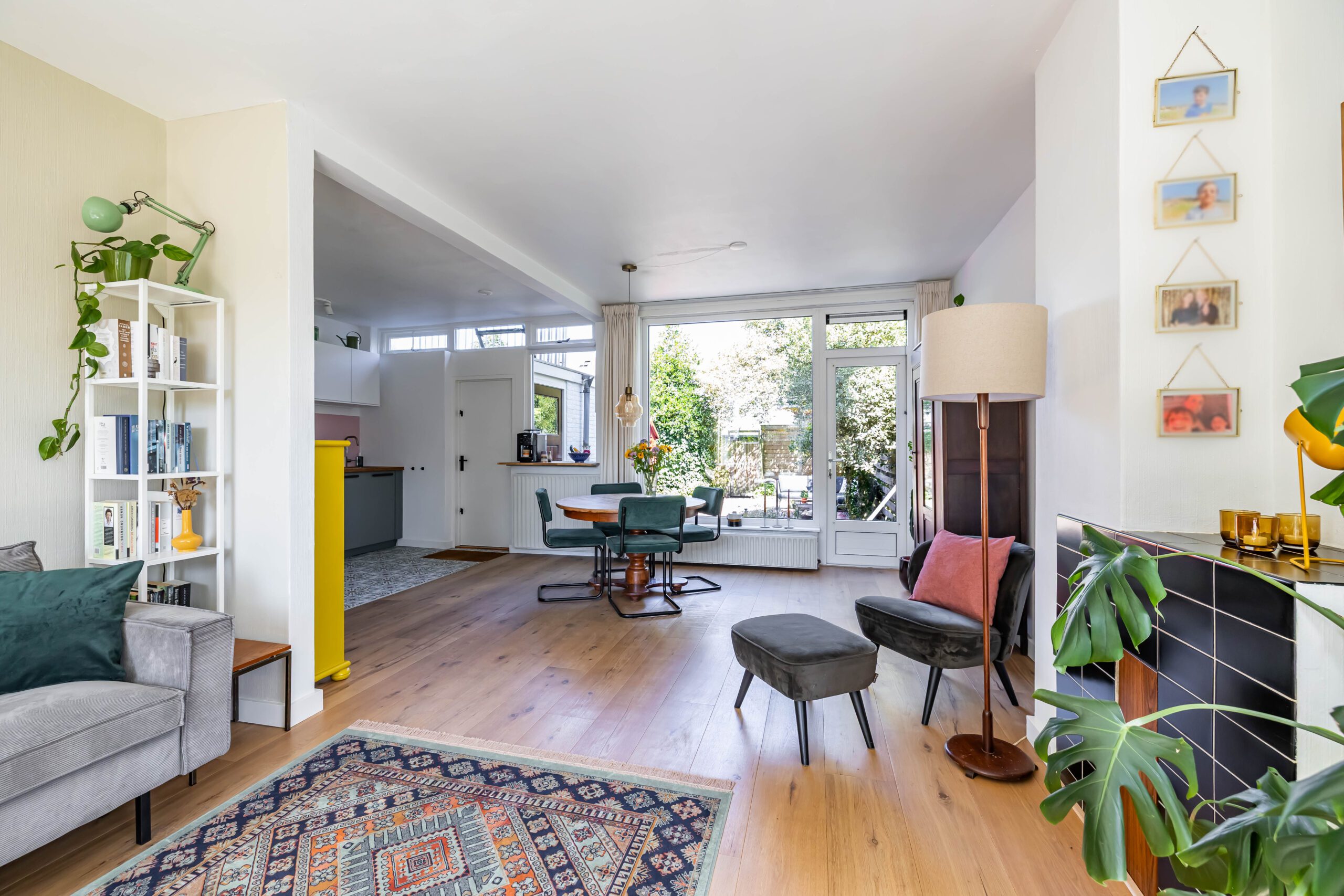 Begane grond: entree, hal met toilet en meterkast, sfeervolle woonkamer met open keuken en deur naar de tuin, de woonkamer en keuken zijn samen circa 38 m² en de keuken is in 2023 geplaatst, ruime bijkeuken van circa 6 m² met wasmachine-aansluiting en deur naar de tuin.