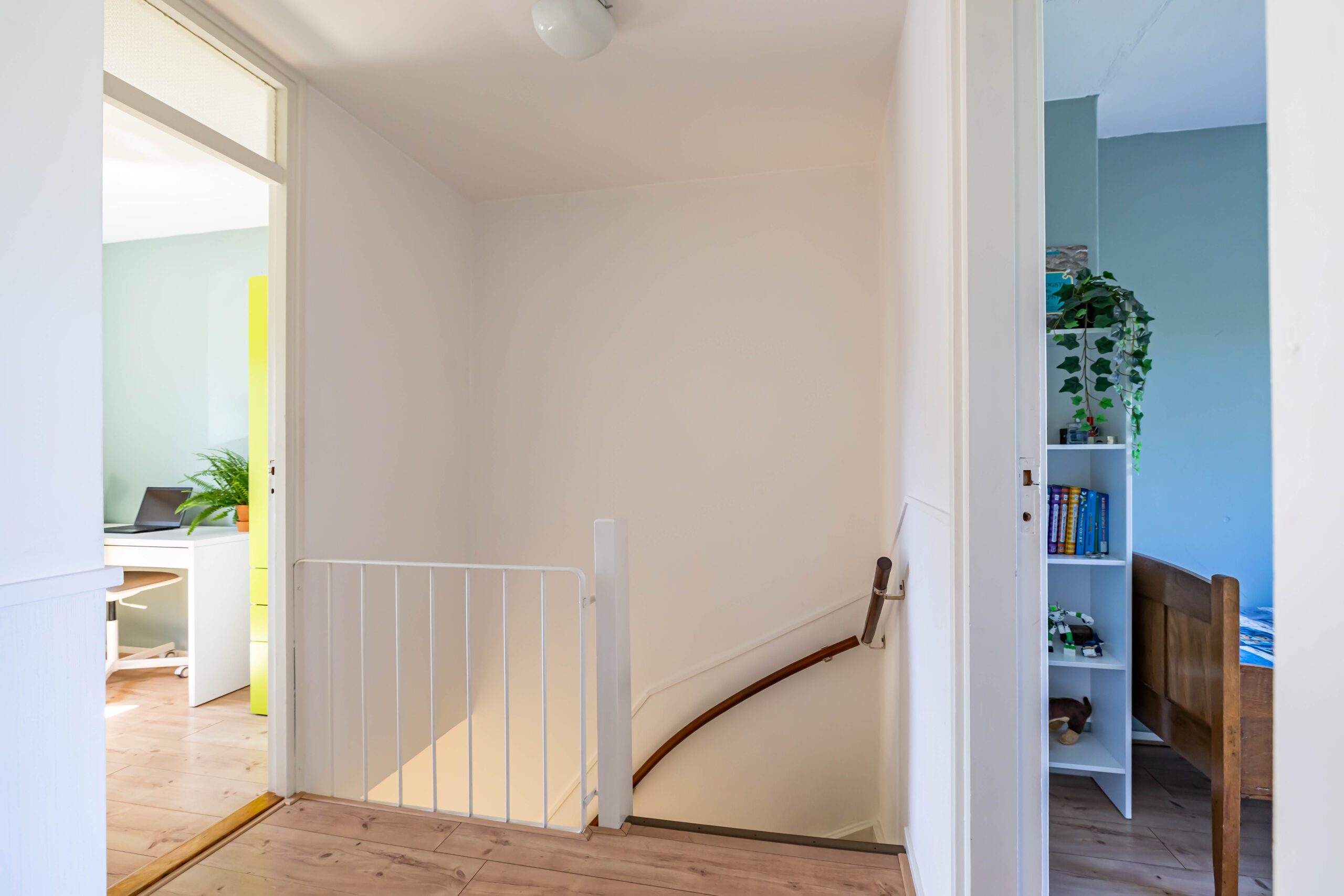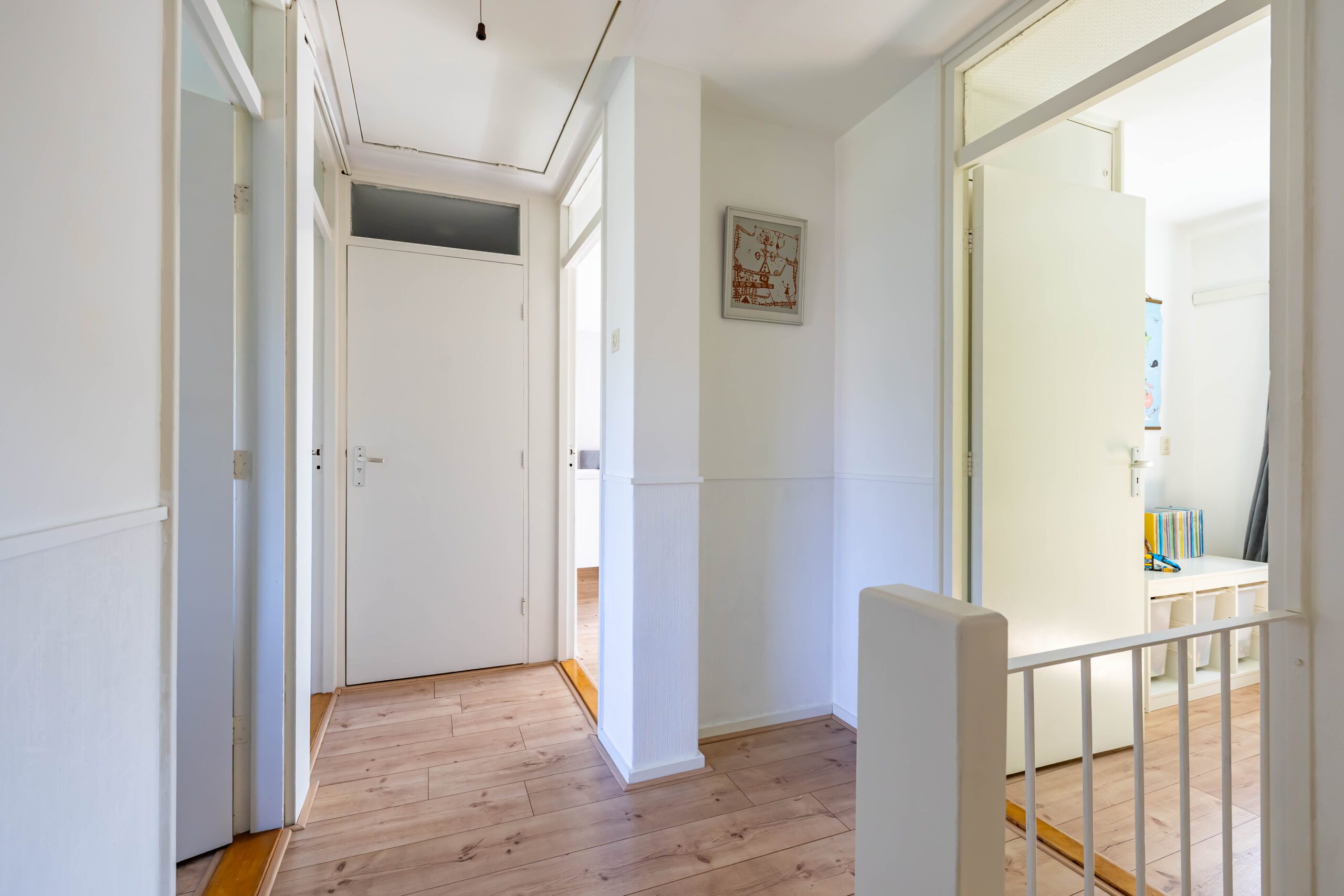 1e verdieping: overloop, vier slaapkamers van resp. circa 6, 6, 11 en 14 m² v.v. vaste kasten, de kleine slaapkamer aan de achterkant heeft een balkon, de badkamer is vernieuwd in 2024 en is voorzien van een inloopdouche en wastafelmeubel.