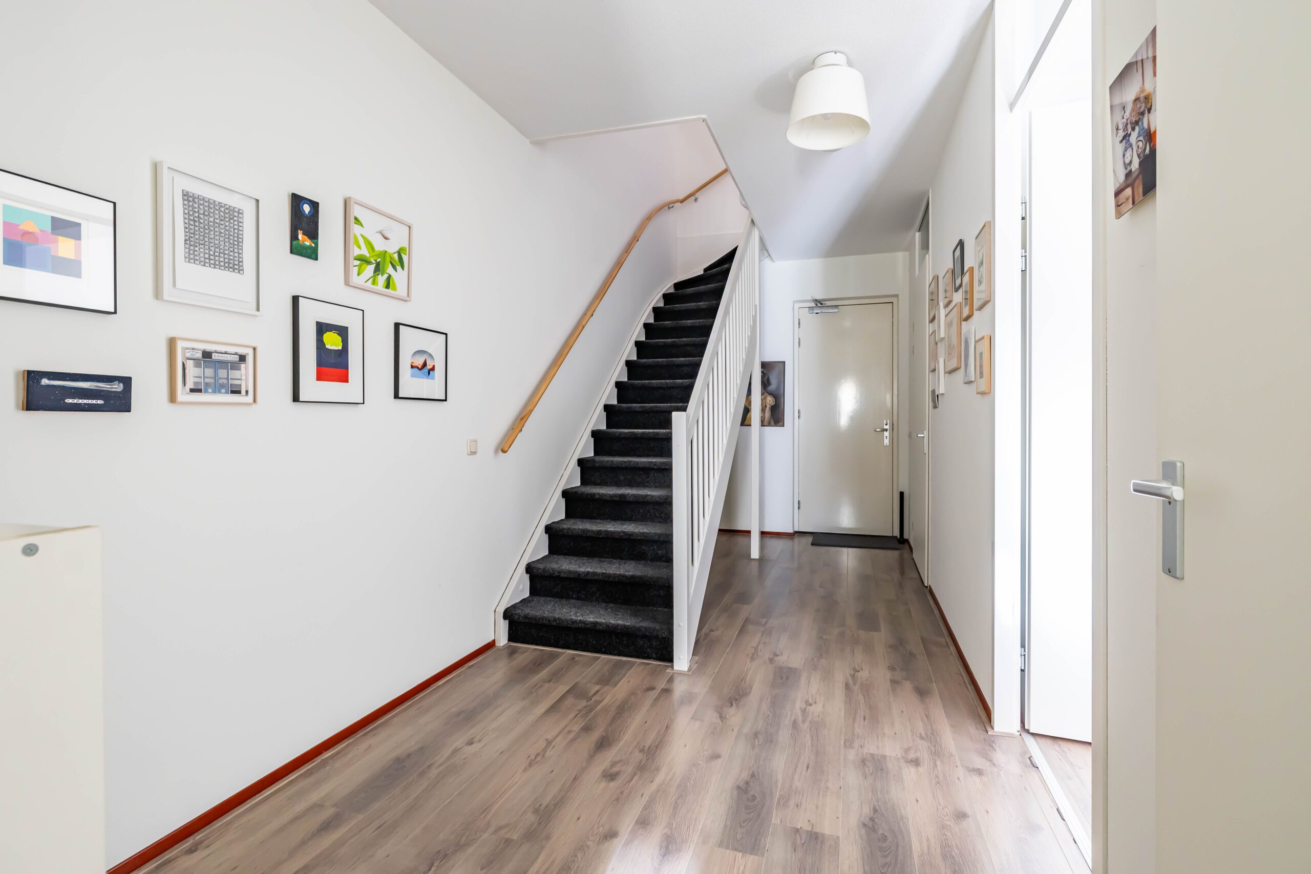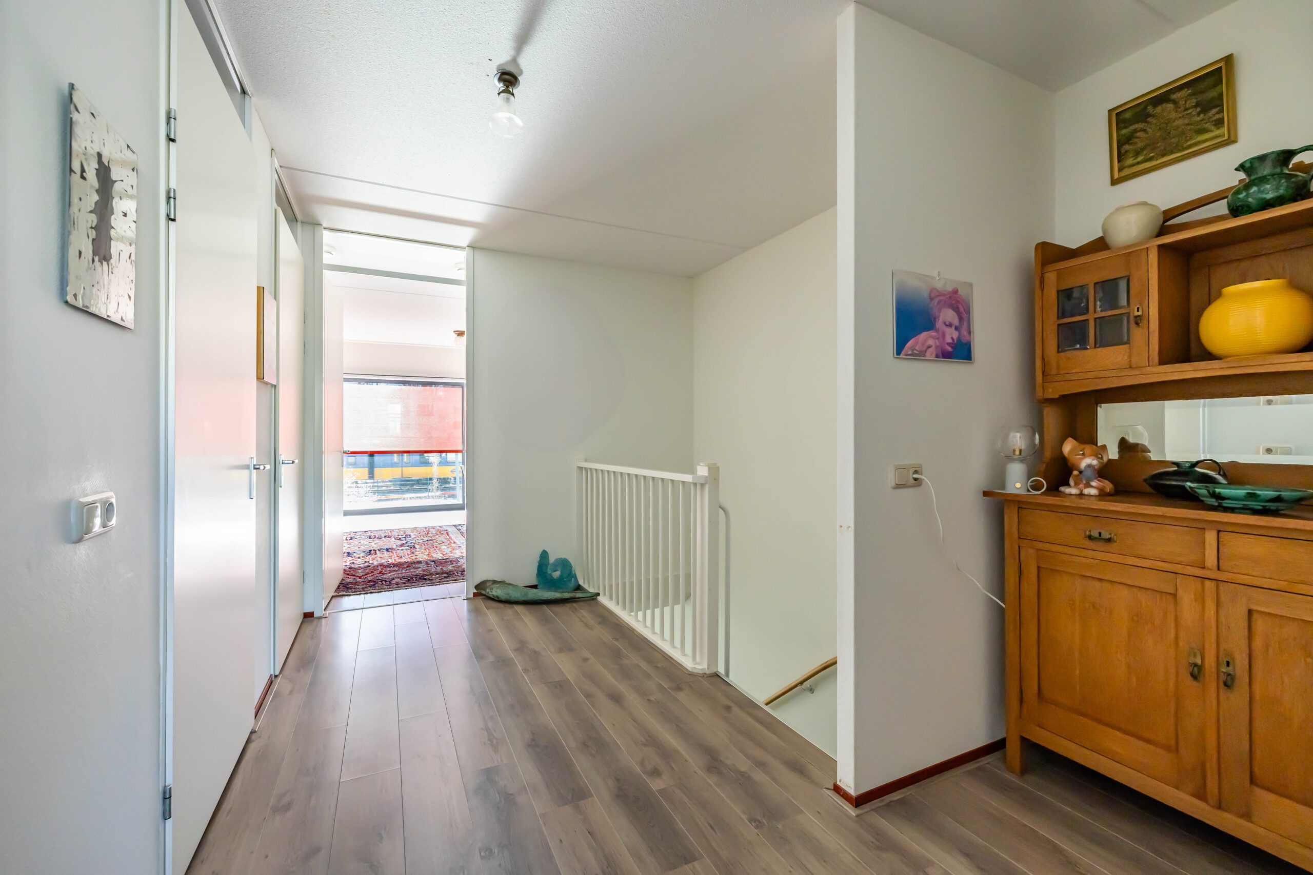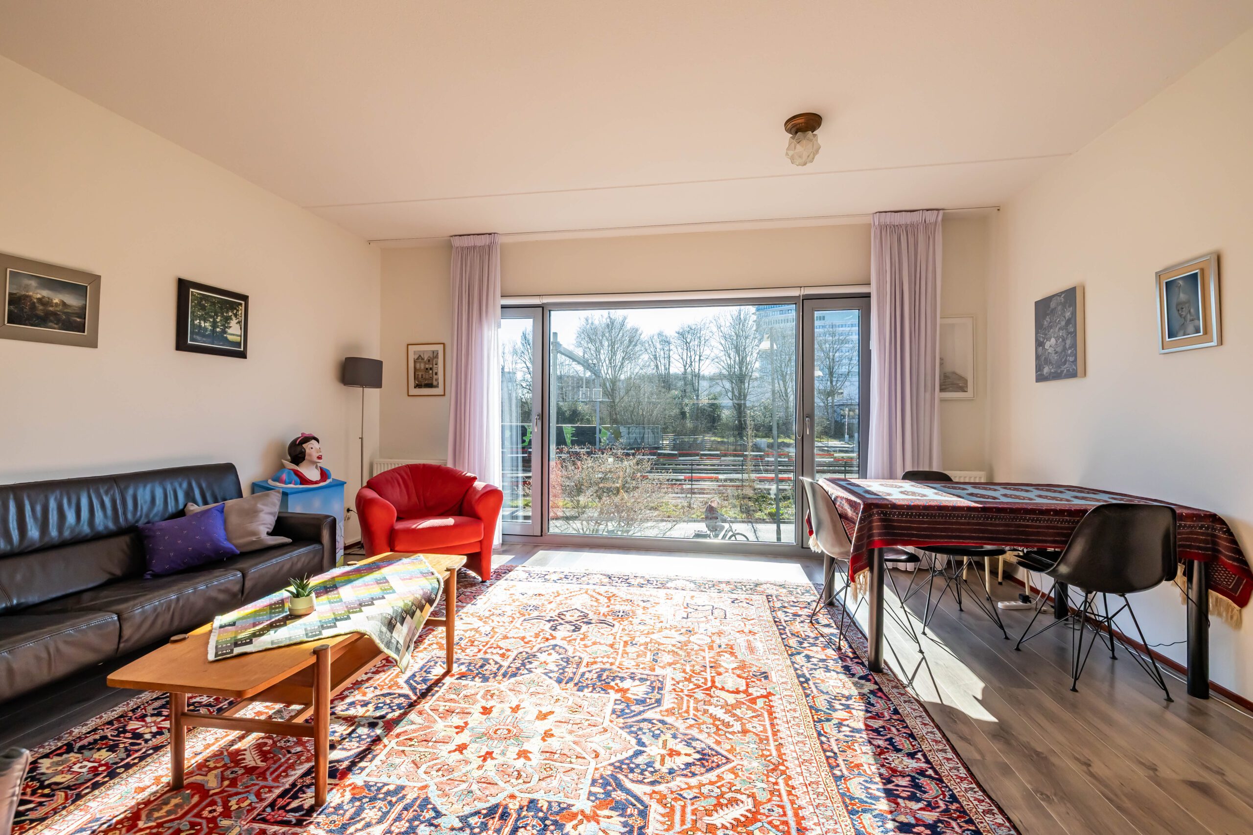 Verdieping: ruime overloop met toilet, lichte woonkamer van circa 25 m², technische ruimte van circa 3 m² met wasmachine-aansluiting, slaapkamer van circa 12 m², dichte keuken van circa 9 m² v.v. inbouwapparatuur, toegang naar de tuin/terras en de grote gezamenlijke binnentuin.