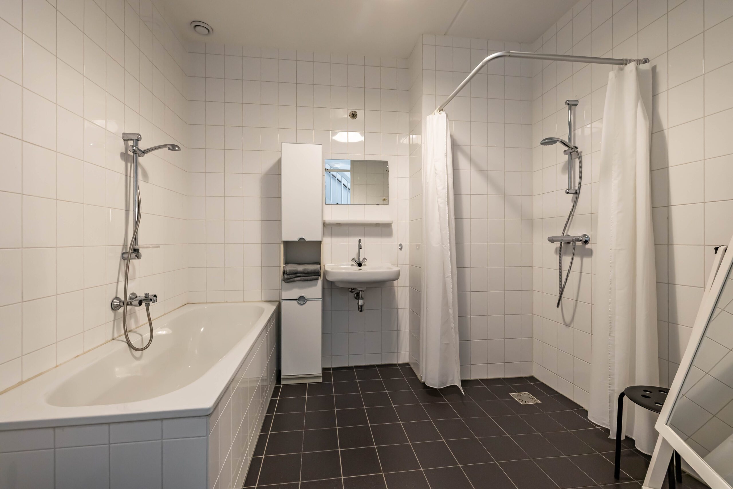 Begane grond: entree met meterkast, ruime hal, slaapkamer van circa 13 m², ruime badkamer van circa 7 m² met ligbad, douchehoek, wastafel en toilet, deur naar de parkeerplaats/garage, berging van circa 5 m².